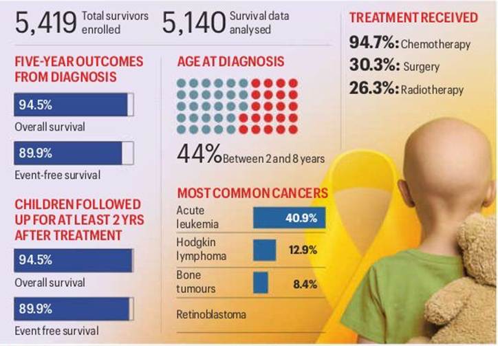 - India’s C2S (Childhood Cancer Survivorship) cohort tracked 5,419 survivors across 20 centres.