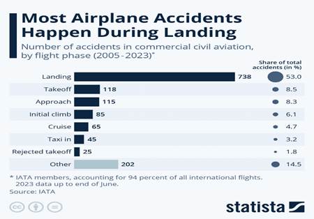 - According to data from the trade group International Air Transport Association (IATA), the landing phase accounted for more than half (53%) of all aviation accidents from 2005 to 2023.